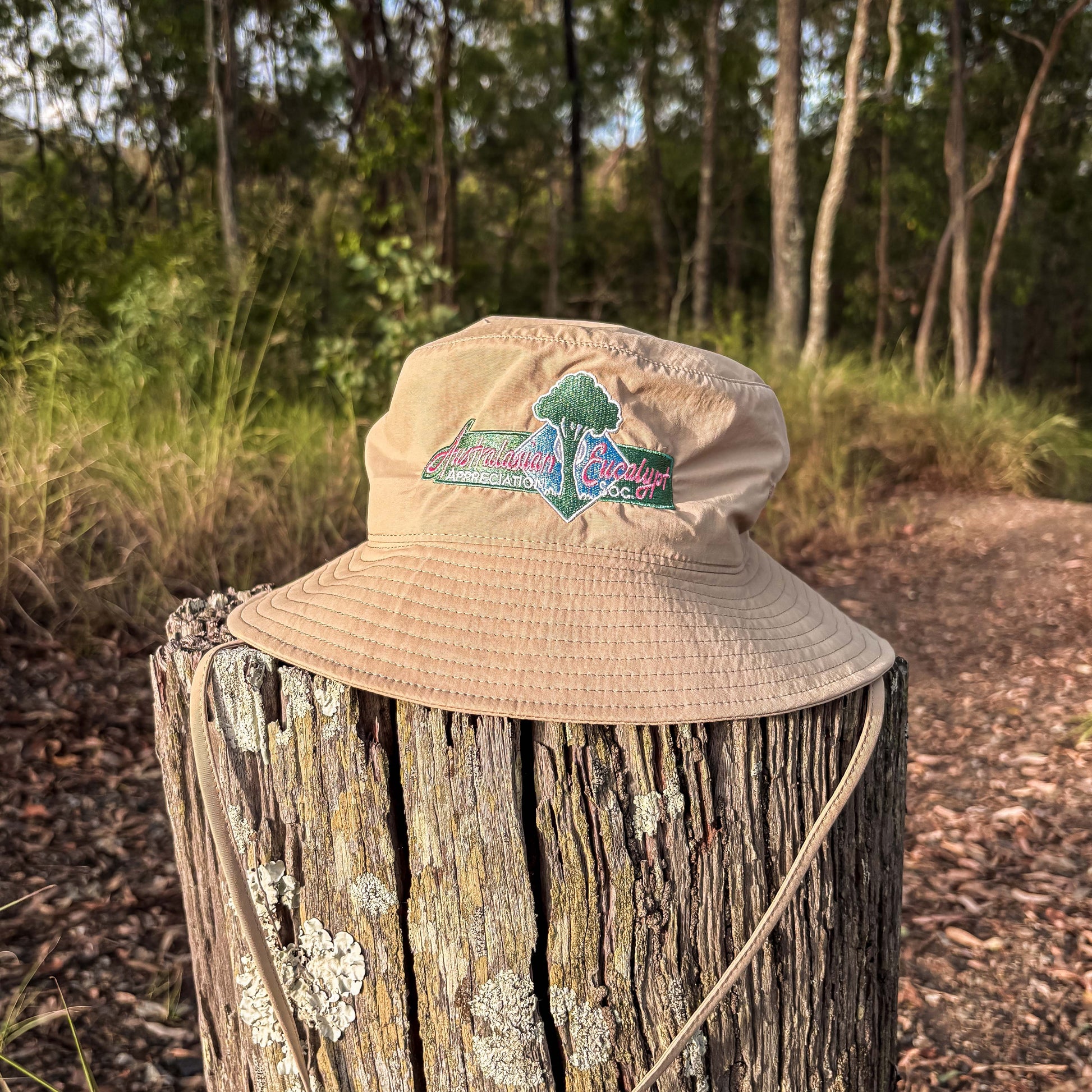 May I present the latest Australasian Eucalypt Appreciation Society graphic embroidered on the AS Colour Nylon Broad Brim Hat in Khaki.